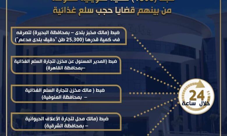 وكذا ضبط (27) قضية إستيلاء على السلع المدعومة بمضبوطات أبرزها (8,250 طن دقيق بلدى “عينى”- 81,978 طن “سكر تموينى – أقماح محلية” – 353 إسطوانة بوتاجاز – 20200 لتر مواد بترولية).. بحجم مضبوطات “سلع غذائية” بلغت إجمالى (859,003 طن “مستندى – عينى”) أبرزها (49,350 طن دقيق بلدى مدعم “مستندى”– 8,250 طن دقيق بلدى “عينى”- 30,290 طن أرز أبيض “عينى”- 637,820 طن أرز شعير “عينى” – 39,395 طن “مكرونة – سكر حر – ملح – عدس – فول – مسلى – شعرية سريعة التحضير – أعلاف” – 11,520 طن “دقيق أبيض عينى ” – 81,978 طن “سكر تموينى – أقماح محلية” ، وكذا ضبط (5760 عبوة زيت طعام – 353 إسطوانة بوتاجاز – 20200 لتر مواد بترولية – 3830 عبوة سجائر) كان أبرزها الآتى :-