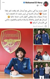 وكان النجم المصري محمد النني انضم لصفوف أرسنال مطلع موسم 2016 قادماً من بازل السويسري في صفقة كلفت خزينة أرسنال 12 و نص مليون يورو و شارك الدولي المصري في 155 مباراة رفقة الارسنال وسجل خلالهم 6 أهداف وساهم في 10 تمريرا خلال السنوات السبع التي قضاها مع النادي.