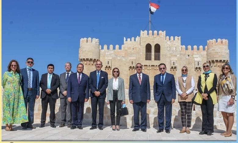 🔻حضر اللقاء والجولة؛ من الجانب المصري الدكتورة جاكلين عازر نائب المحافظ ، والسيد السفير أشرف منير نائب مساعد وزير الخارجية، واللواء خالد جمعة السكرتير العام المساعد بالمحافظة، واللواء حسام الشيخ رئيس حي الجمرك، والدكتور حسام عبد الباسط مدير عام مناطق آثار الإسكندرية والساحل الشمالي للآثار الإسلامية، وشيرين مصطفي مدير عام الهيئة الإقليمية لتنشيط السياحة بالإسكندرية، ومن الجانب الإيبروأمريكي السادة سفراء المكسيك ، الإكوادور، جواتيمالا، الأرجنتين، بنما، كوبا، فنزويلا، شيلي ، أسبانيا، كولومبيا ، البرازيل، البرتغال ، الدومينيكان ، وأوروجواي، والقائمين بأعمال سفارة بوليفيا ، بيرو ، وباراجواي.