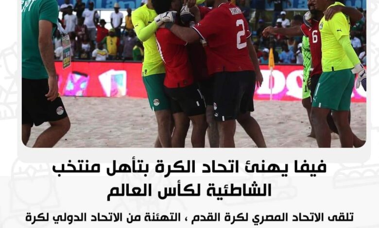 تلقى الاتحاد المصري لكرة القدم ، التهئنة من الاتحاد الدولي لكرة القدم “فيفا” بمناسبة تأهل منتخب مصر للكرة الشاطئية إلى نهائيات بطولة كأس العالم 2023 لأول مرة.
