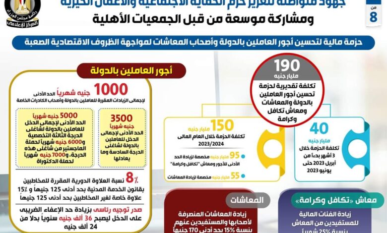 يأتي هذا بينما تبلغ تكلفة الحزمة 150 مليار جنيه خلال العام المالي 2023/2024، وتشمل مبلغ 95 مليار جنيه مخصص لزيادة الحد الأدنى للأجور ومعاش “تكافل وكرامة”، بجانب 55 مليار جنيه مخصصة لزيادة المعاشات.