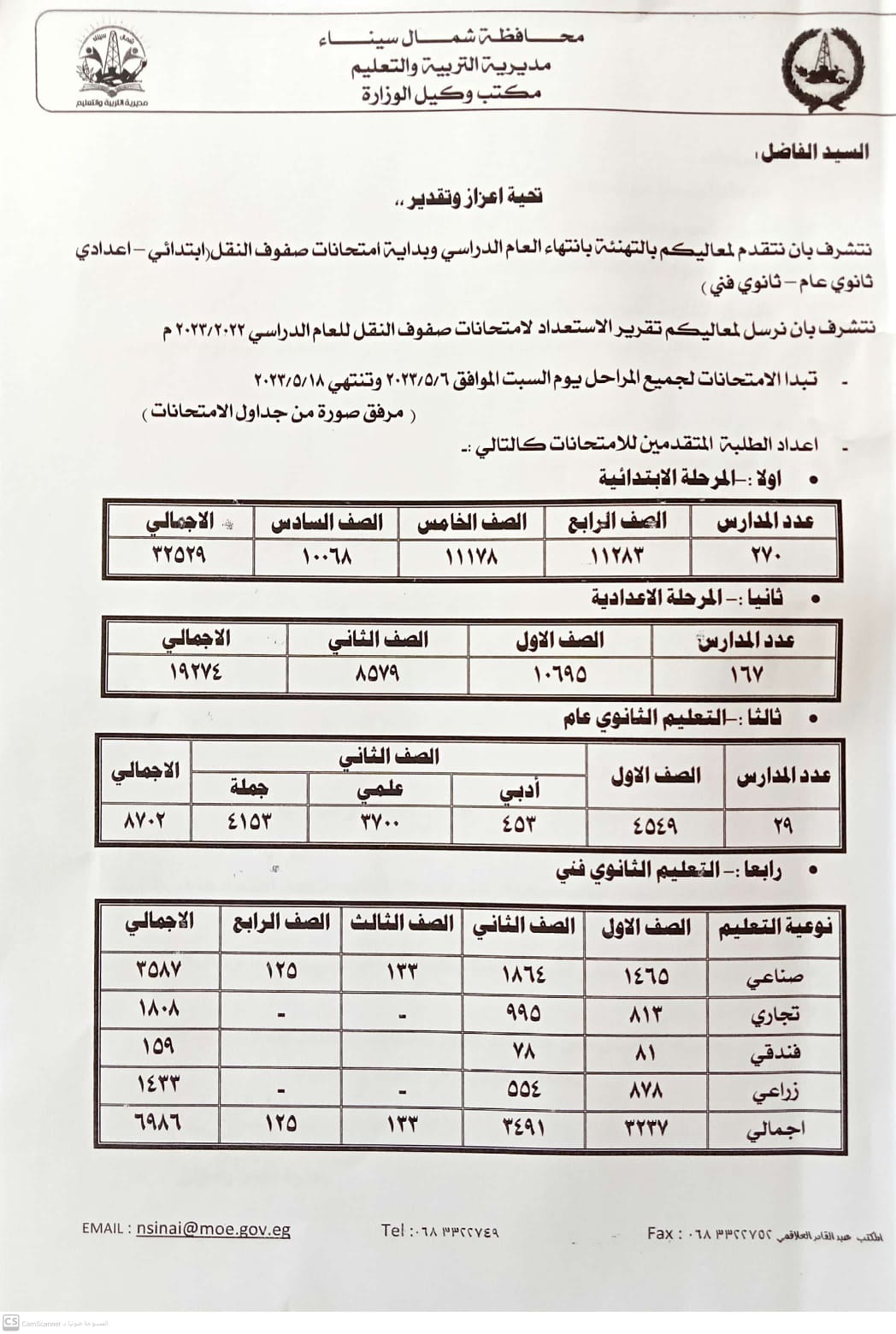 من جانبه أكد حمزة رضوان وكيل وزارة التربية والتعليم، أن نحو 60 ألف طالبة وطالبة بسنوات النقل في المراحل الابتدائية والإعدادية والثانوية العامة والفنية يؤدون امتحانات الفصل الدراسي الثاني ونهاية العام.