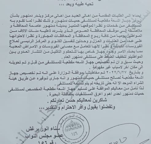 وقالت سناء برغش عضو مجلس النواب ، أنها نجحت بفضل مساعدة المسئولين بوزارة الصحة ، فى إمداد مستشفى حميات دمنهور بجهاز أشعة مقطعية حديث لخدمة اهالينا بمركز و مدينة دمنهور ،