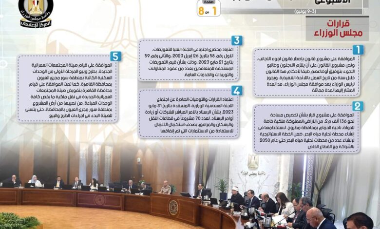 الحصاد الأسبوعي لمجلس الوزراء خلال الفترة من 3 حتى 9 يونيو 2023