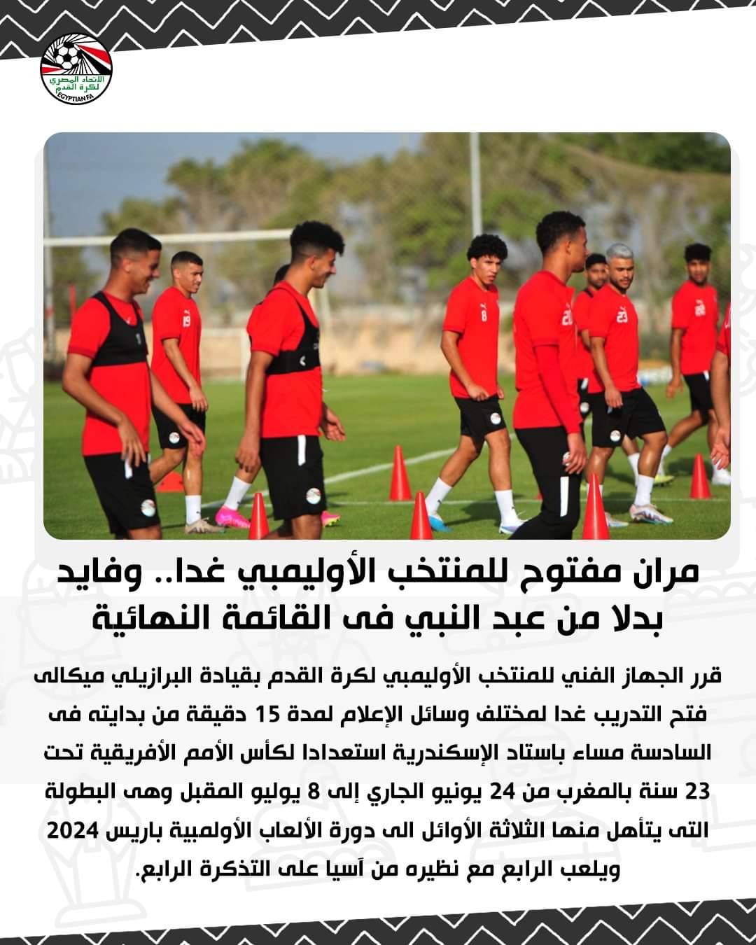 قرر الجهاز الفني للمنتخب الأوليمبي لكرة القدم بقيادة البرازيلي ميكالى فتح التدريب غدا لمختلف وسائل الإعلام لمدة 15 دقيقة من بدايته فى السادسة مساء باستاد الإسكندرية استعدادا لكأس الأمم الأفريقية تحت 23 سنة بالمغرب من 24 يونيو الجاري إلى 8 يوليو المقبل وهى البطولة التى يتأهل منها الثلاثة الأوائل الى دورة الألعاب الأولمبية باريس 2024 ويلعب الرابع مع نظيره من آسيا على التذكرة الرابع .