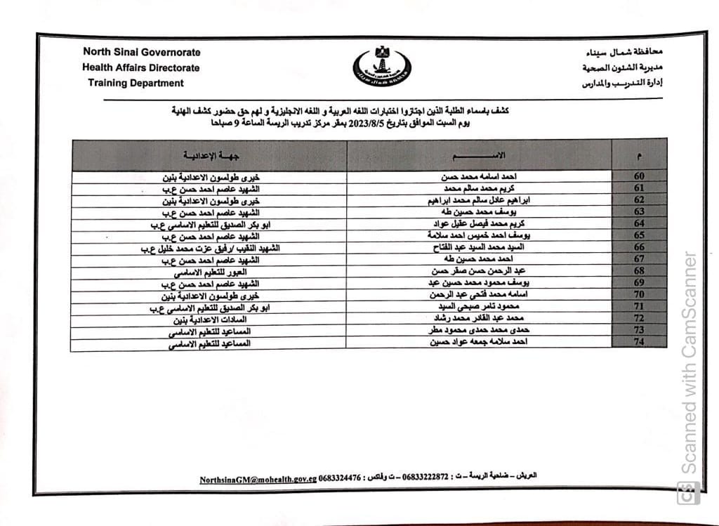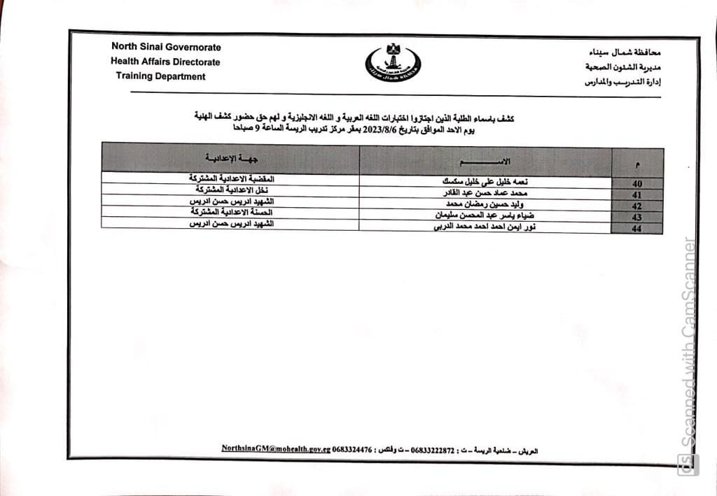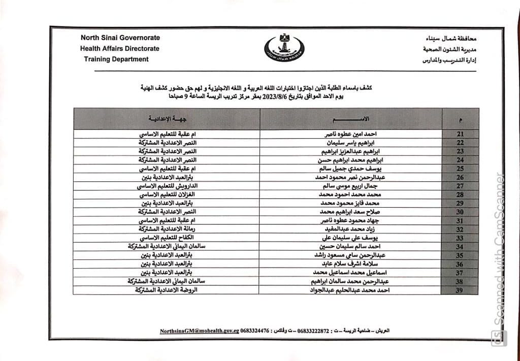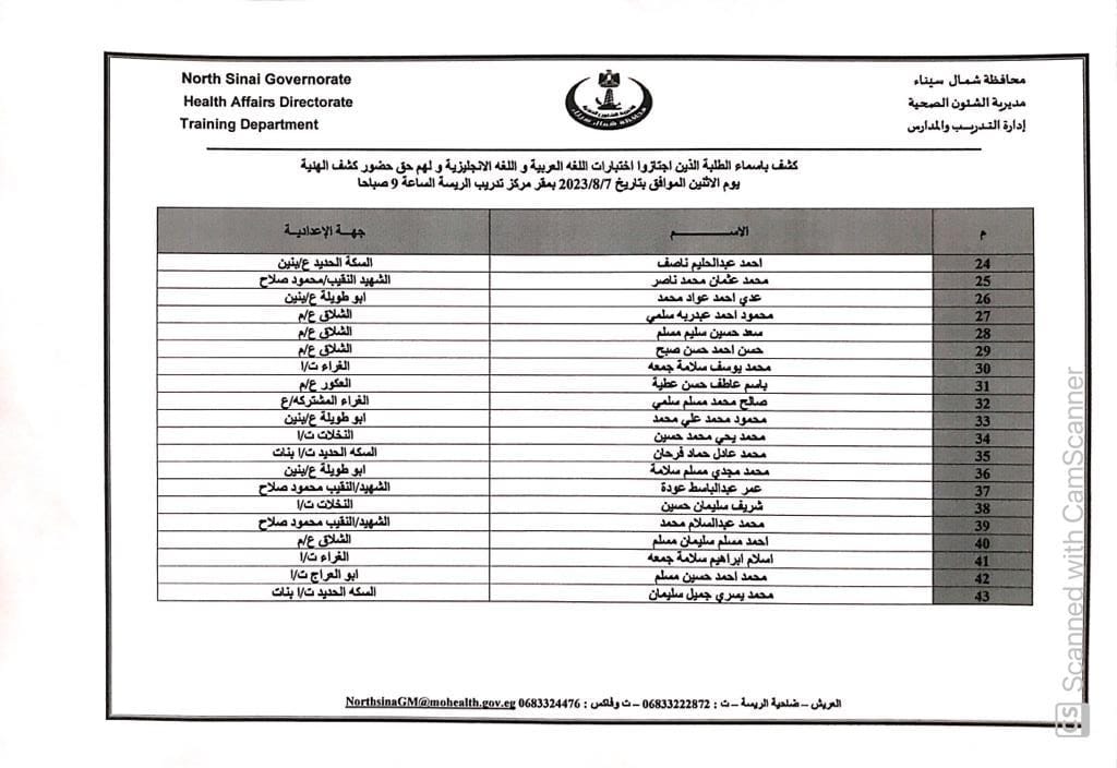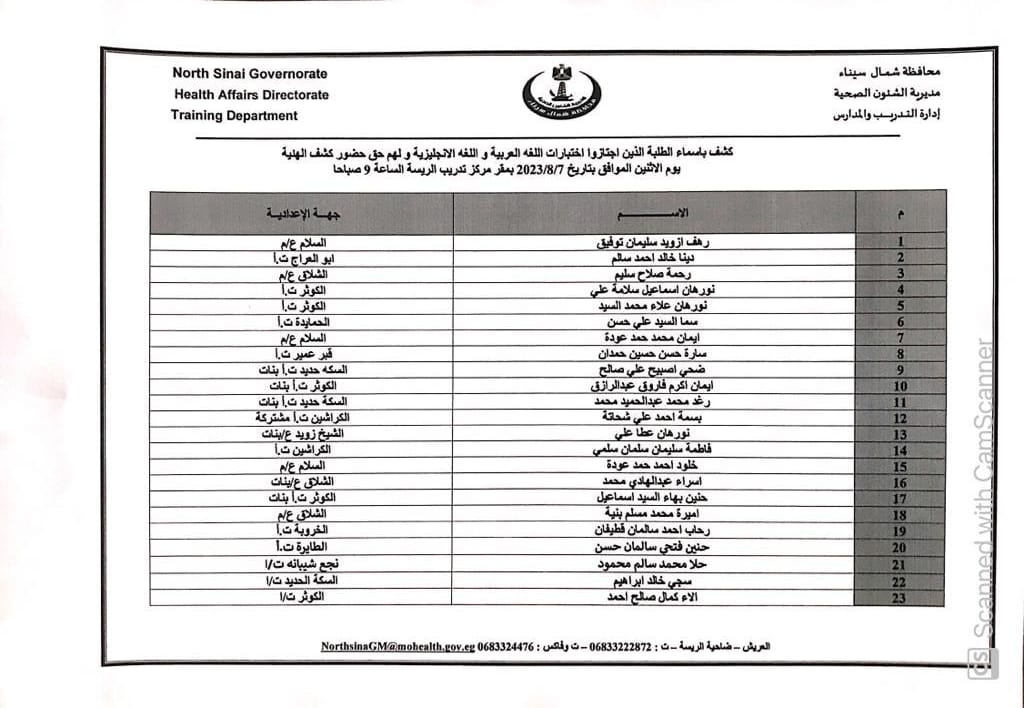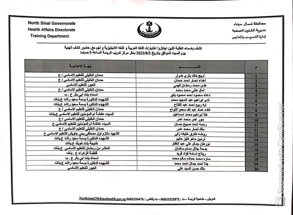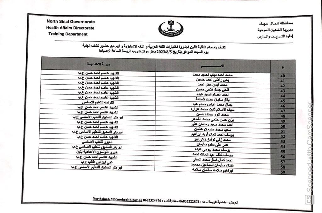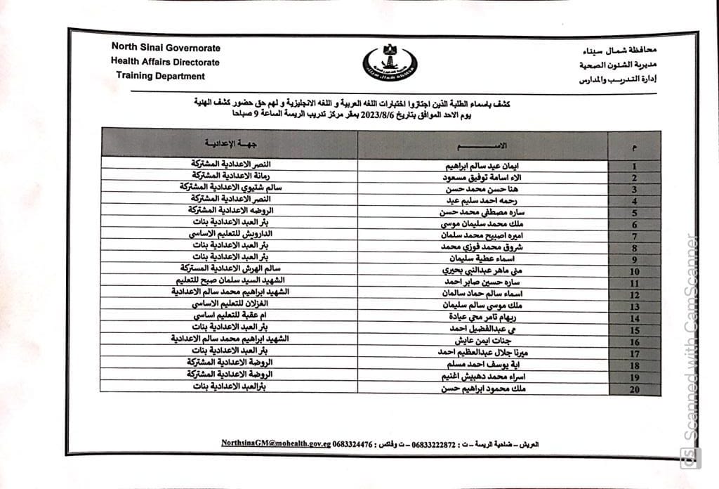 أعلنت مديرية الشؤون الصحية بشمال سيناء أسماء الطلاب الذين اجتازوا اختبارات الإملاء و اللغة الإنجليزية بنجاح ولهم الحق في دخول كشف الهيئة لمدارس التمريض للعام الدراسي ٢٠٢٣ /٢٠٢٤ .