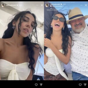 وكانت برفقة الفنان خالد الصاوي، وظهرت في الصورة ب إطلالة صيفية جريئة بتوب أبيض بدون حمالات، مع تسريحة شعر كيرلي.