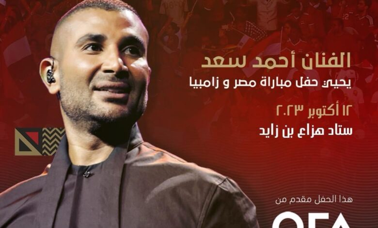 يحيي الفنان أحمد سعد حفل مباراة منتخب مصر الأول لكرة القدم أمام زامبيا في اللقاء الودي المقرر له ١٢ أكتوبر الجاري باستاد هزاع بن زايد بدولة الإمارات الشقيقة .