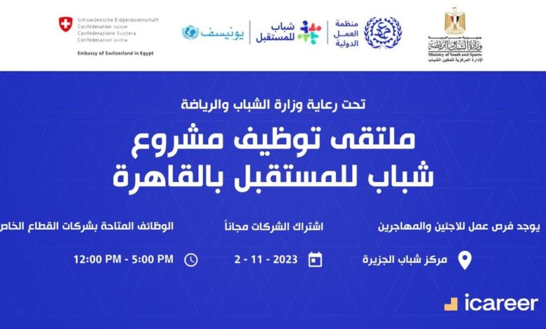 تنظم وزارة الشباب والرياضة من خلال الإدارة المركزية لتمكين الشباب (الإدارة العامة للمبادرات الشبابية)، بالتعاون مع منظمة العمل الدولية، ملتقى توظيف الشباب “مشروع شباب للمستقبل” بمركز شباب الجزيرة بمحافظة القاهرة، يوم الخميس الموافق ٢ نوفمبر 2023، من الساعة ال١٢ ظهرا وحتى الخامسة مساء، بالتعاون مع شركات القطاع الخاص.