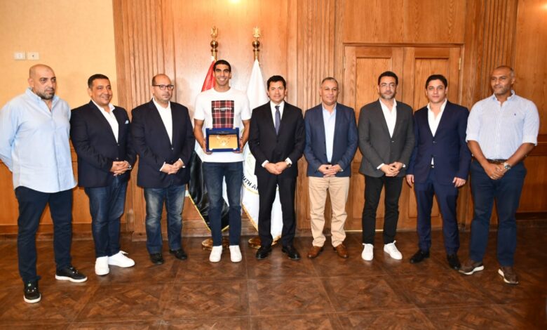 وزير الرياضة يكرم عبد الرحمن سامح لاعب المنتخب الوطني للسباحة