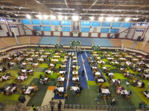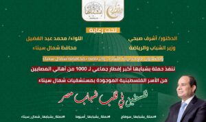 نظمت مديرية الشباب والرياضة بشمال سيناء”ادارة البرلمان والتعليم المدني” حملة بشبابها حفل الإفطار الجماعي للأشقاء الفلسطينيين العالقين في شمال سيناء، في الصالة المغطاة بالعريش.