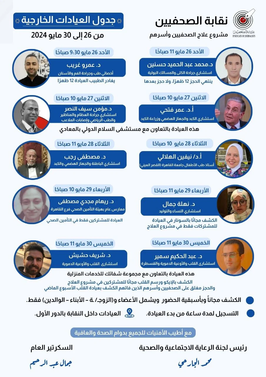 والكشف في العيادات الخارجية مجانًا وبأسبقية الحضور لكل الصحفيين من أعضاء النقابة وأسرهم، وينتهي التسجيل بعد ساعة من بدء العيادة بالدور الأول بالنقابة، وتشهد العيادات الخارجية هذا الأسبوع مشاركة الدكتور عمر فتحي استشاري الكبد والجهاز الهضمي وزراعة الكبد، والدكتور مؤمن سيف النصر استشاري جراحة العظام والمناظير والطب الرياضي وإصابات الملاعب، وذلك بالتعاون مع مستشفى السلام الدولي بالمعادي.