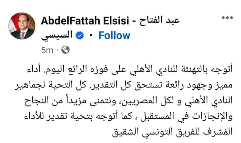 وقال الرئيس عبد الفتاح السيسي: “أتوجه بالتهنئة للنادي الأهلي على فوزه الرائع اليوم. أداء مميز وجهود رائعة تستحق كل التقدير. كل التحية لجماهير الأهلي و لكل المصريين، ونتمنى مزيداً من النجاح والإنجازات في المستقبل، كما أتوجه بتحية تقدير للأداء المُشرف للفريق التونسي الشقيق”.