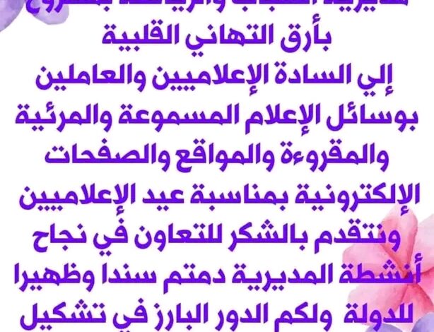 رفاعى” مدير عام الشباب والرياضة بمطروح يهنئ الإعلاميين بعيدهم الـ ٩٠