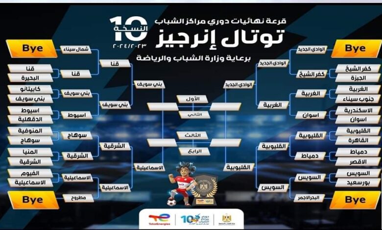 وبحسب الجدول المعلن، تُسفر مواجهات نهائي دوري مراكز الشباب توتال انرجيز عن: الوادي الجديد مع القليوبية، ومنتخب الإسماعيلية مع منتخب بني سويف.