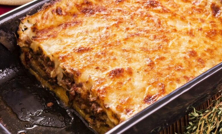 5.ضعي اللحم ثم البشاميل ثم انثري الجبن
