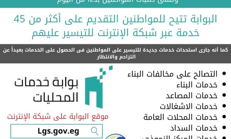فى بشرى سارة لمواطنى المحافظة … محافظ البحيرة تعلن تدشين بوابة خدمات المحليات للمحافظة وتلقى طلبات المواطنين بدءا من اليوم البوابة تتيح للمواطنين التقديم على أكثر من ٤٥ خدمة عبر شبكة الإنترنت للتيسير عليهم