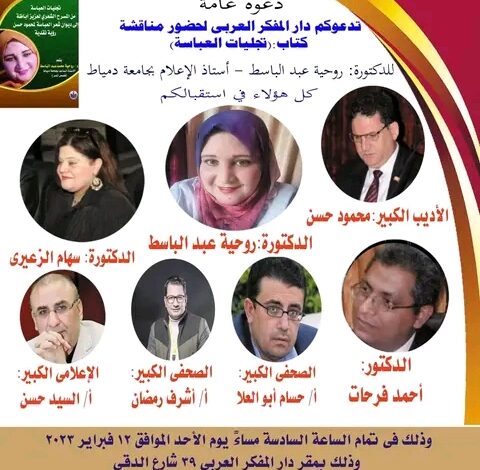 تعقد دار المفكر العربي غدا الأحد الساعة السادسة مساء ندوة كبرى لمناقشة المسرحية الشعرية الجديدة للشاعر المصري الكبير محمود حسن عبد التواب والتي تعقد تحت عنوان تجليات العباسة من المسرح الشعرى عند عزيز أباظة إلى الشعر الدرامى عند محمود حسن..