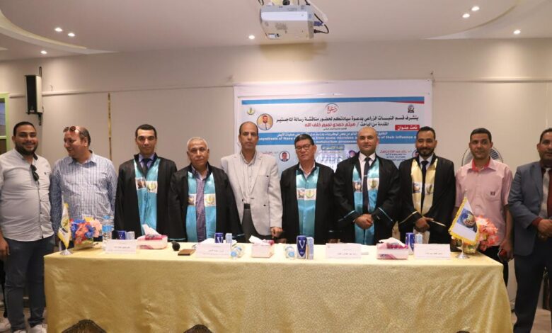 وتكونت لجنة المناقشة والحكم من الدكتور راشد عبد الفتاح زغلول، استاذ الميكروبيولوجيا الزراعية بكلية الزراعة جامعة بنها ووكيل الكلية لشئون التعليم والطلاب الأسبق “مشرفا ومناقشا”، والدكتور ثروت محمد الأمين، أستاذ الوراثة بكلية الزراعة جامعة جنوب الوادي ورئيس قسم النبات الزراعى “مشرفا ومناقشا”، والدكتور سمير أحمد سيد حداد، استاذ الميكروبيولوجيا الزراعية ورئيس قسم الميكروبيولوجيا الزراعية بكلية الزراعة جامعة المنيا “مناقشا خارجى”، والدكتور هانى صابر محمد أحمد استاذ الطحالب المساعد بكلية العلوم جامعة جنوب الوادى “مناقشا داخلى”.