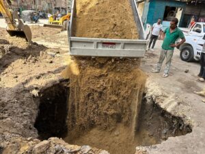 وبعد ذلك، تم تطبيق طبقة ترميم بالمخلوط الأسفلتي على شارع حسب النبي، وبدأت أعمال الإصلاح في شارع الخلفاء الراشدين استعدادًا لوضع الطبقة السطحية.