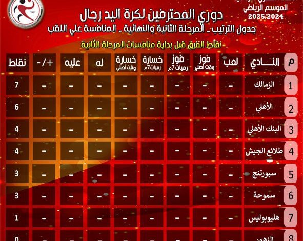 تنطلق غدًا الجمعة، مباريات المرحلة الثانية والنهائية للمنافسة على لقب دوري المحترفين لكرة اليد.