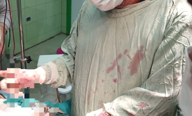 وتم التحرك على وجه السرعه للتدخل الجراحي العاجل خلال دقائق لأهميه عامل الوقت فى انقاذ الحالة ، و من ثم عمل استكشاف جراحي عاجل و تبين وجود نزيف حاد شديد حول القلب ، ووجود جرح نافذ بالبطين الأيمن بعضلة القلب ، ونزيف حاد بالصدر والغشاء البللوري ، وتم التحكم بالنزيف وعمل اصلاح أولي للجزء المقطوع و تركيب انبوبه صدر لحسن استقرار الحاله .