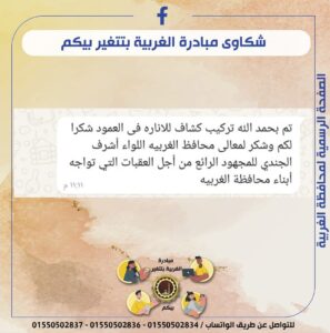 وأشار محافظ الغربية إلى أن المبادرة حققت نجاحًا ملموسًا منذ إطلاقها، حيث تم التعامل مع آلاف الشكاوى خلال الفترة الماضية، وتم حل نسبة كبيرة منها في وقت قياسي، مما يعكس حرص المحافظة على تقديم خدمات سريعة وفعالة للمواطنين. وأضاف أن هذا النجاح لن يتحقق إلا بتعاون المواطنين ومشاركتهم الفعالة في تقديم الشكاوى والمقترحات بشكل دقيق ومنظم، مما يسهم في تحقيق أقصى استفادة من هذه المبادرة.