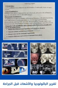 وتشكل فريق الباثولوجي الذى قام بتحليل الورم معمليا ومعرفة نوعه فور إستئصاله من الفك : الدكتورة مروة عبدالحق أستاذ والدكتورة نهال هيبه أستاذ مساعد والدكتورة آيه سعيد مدرس والدكتورة هاجر الجبالى معيد .
