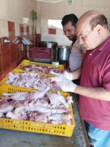 وقد تضمنت المخالفات تحرير 18 محضرًا لضبط 110.5 كجم لحوم مذبوحة خارج المجازر، ومحضر واحد لكمية 10 كجم لحوم يشتبه في صلاحيتها وتم سحب عينات منها للفحص المعملي، بالإضافة إلى 6 محاضر لمصنعات لحوم بإجمالي 373.5 كجم، ما بين غير صالحة للاستهلاك الآدمي أو معروضة دون بيانات أو يشتبه في صلاحيتها، كما تم تحرير محضر لأسماك مجمدة بكمية 25 كجم يشتبه في صلاحيتها وسحب عينات منها، و5 محاضر للدواجن بإجمالي 65 كجم، تضمنت مخالفات لعدم وجود بيانات أو اشتباه في الصلاحية.