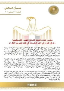 كما دعت مصر كافة دول العالم المحبة للسلام إلى عدم التورط في هذه الجريمة غير الأخلاقية التي تشكل جريمة حرب وتطهيرًا عرقيًا، وخرقًا واضحًا لاتفاقيات جنيف الأربع، محذرة من المسؤولية التاريخية والقانونية التي ستقع على أي طرف يشارك في تلك المخططات وما قد تجره من تداعيات إقليمية ودولية خطيرة.
