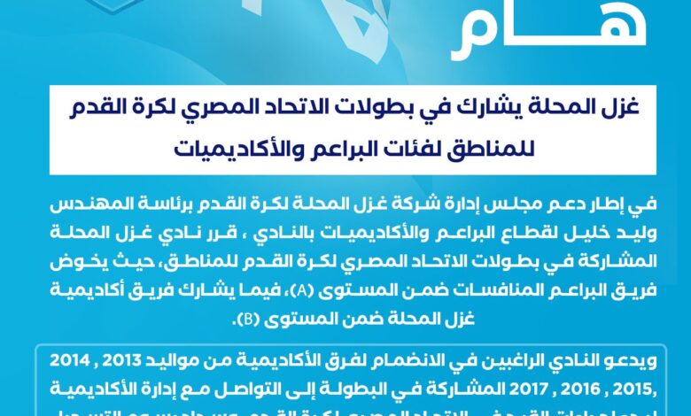 غزل المحلة يشارك في بطولات الاتحاد المصري لكرة القدم للمناطق لفئات البراعم والأكاديميات