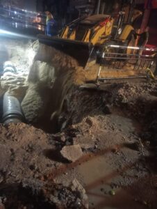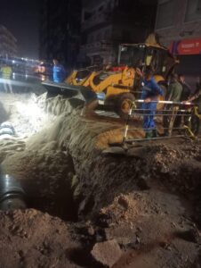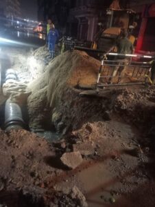 استمرار العمل من مساء أمس حتى صباح اليوم لإنهاء الإصلاح وردم الموقع بالكامل.. وضخ المياه بكامل طاقتها دون تأثر المواطنين