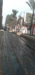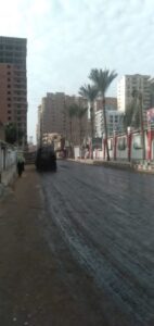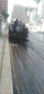 بعد الانتهاء من إحلال وتجديد خط المياه، رش طبقة الـ MCO بالقطاع الثاني تمهيدًا لرصف طبقة الأسفلت
