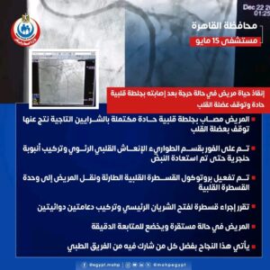 إنقاذ حياة مريض فى حالة حرجه بعد إصابته بجلطة قلبية حادة وتوقف عضلة القلب ” مستشفى ١٥ مايو ”