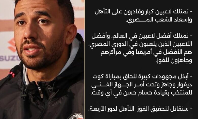 وأوضح لاعب وسط الفراعنة، أنه يبذل مجهودات كبيرة للحاق بمباراة كوت ديفوار، وذلك بعد الإصابة التي تعرض لها في مواجهة بنين، مؤكداً أنه تحت أمر الجهاز الفني للمنتخب بقيادة حسام حسن في أي وقت.