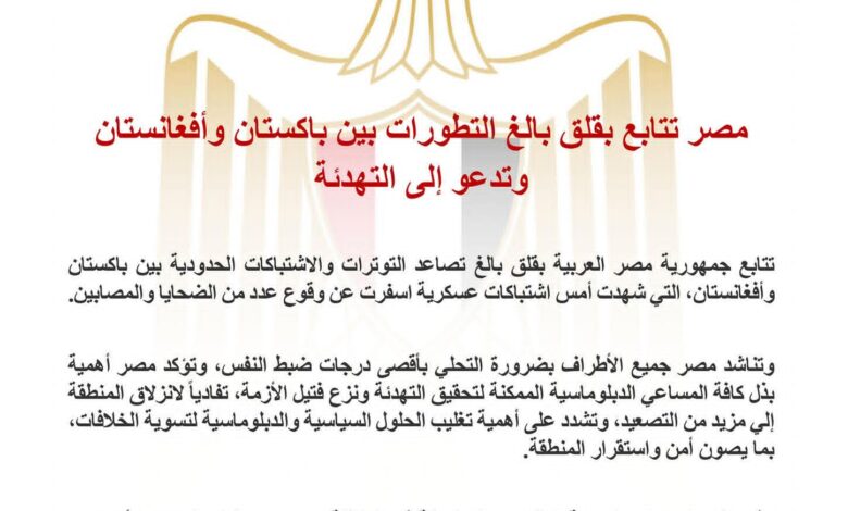 مصر تتابع بقلق بالغ التطورات بين باكستان وأفغانستان وتدعو إلى التهدئة