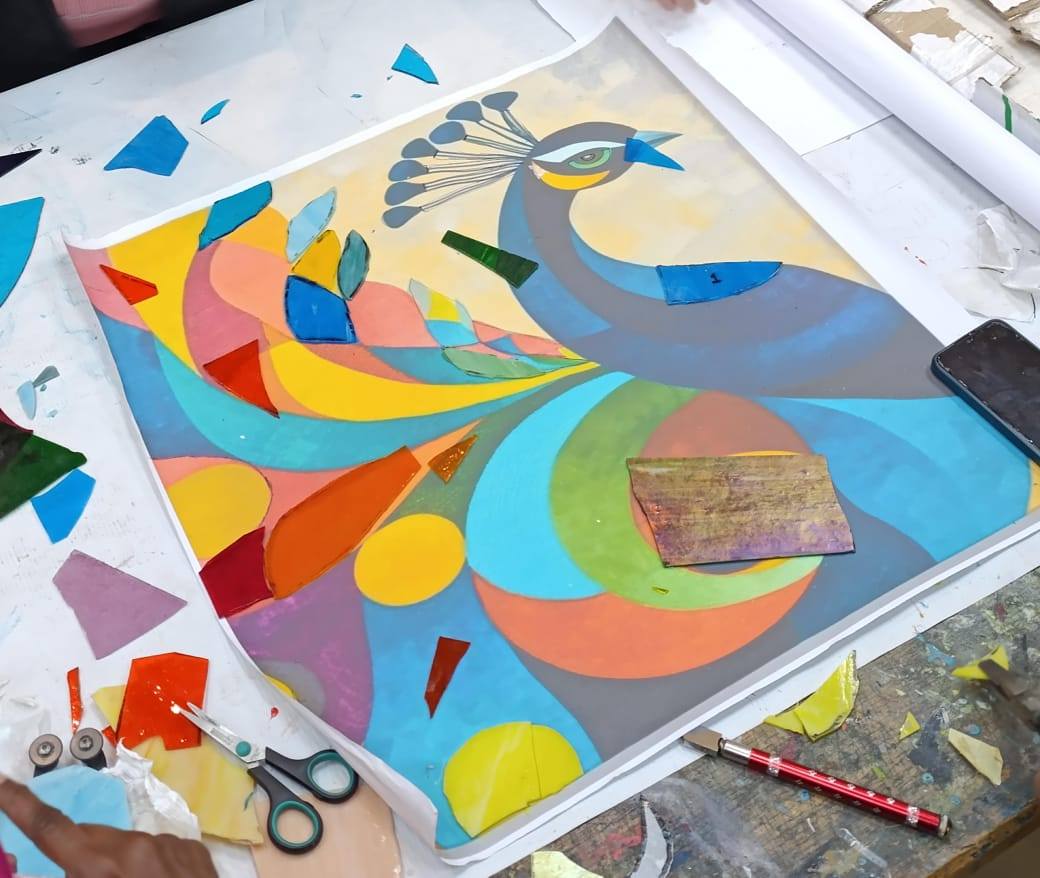 وأضافت أن اليوم الأول شمل تدريب على كيفية نقل التصميم، وطرق القص الصحيحة للقطع الزجاجية. للبدء في تنفيذ تابلوه على شكل طاووس. مع توضيح أسس تنسيق الألوان لإخراج العمل الفني بصورة إبداعية.