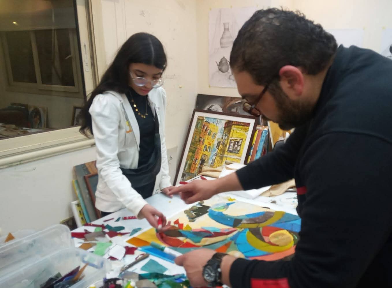 كما واصلت الفنانة سمت سامي تدريب المشاركين على تقطيع أجزاء الزجاج.