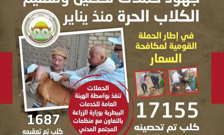 تواصل وزارة الزراعة واستصلاح الأراضي، ممثلة في الهيئة العامة للخدمات البيطرية، بالتعاون مع منظمات المجتمع المدني، تنفيذ الحملة القومية لمكافحة السعار والسيطرة على أعداد الكلاب الحرة بوسائل رحيمة وعلمية.