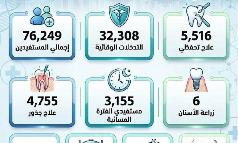 كما تم إجراء ٩ عمليات تحت التخدير الكلي، من بينها ٣ حالات لأطفال، إضافة إلى تنفيذ ٦ حالات زراعة أسنان باستخدام أحدث التقنيات العلاجية المتاحة.