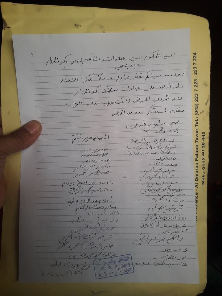 تجمع المرضي ودخلو للدكتور عمر مدير العيادات، ووجدنا عنده الدكتورة مديرة منطقة كفر الدوار، وشكراً لحسن استقبالهم وسعة صدرهم لأنهم لمسو ما يعاني منه المرضى، وهو عدم وجود مراوح بالمبنى نهائي إلا في غرف الكشف والمكاتب فقط.