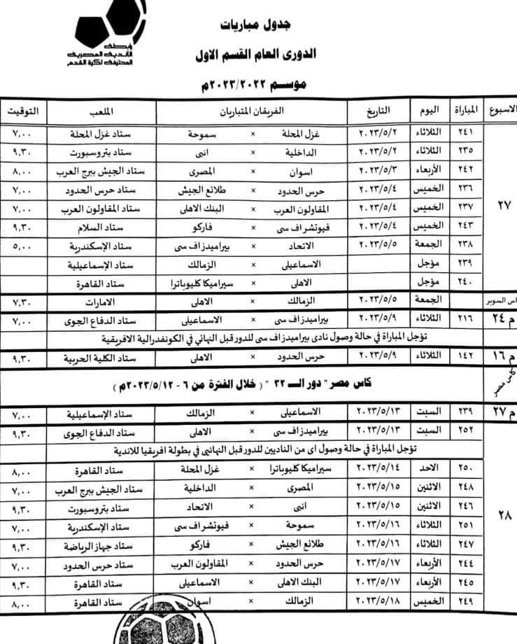 أعلنت رابطة الاندية برئاسة أحمد دياب بالتنسيق مع عامر حسين المشرف على إدارة المسابقات ، عن مباريات الأسبوع ال ٢٧ و ٢٨ و ٢٩ للدوري والمؤجلات الخاصة بالدوري ، إلى جانب الإعلان عن إقامة مباريات دور ال٣٢ و ال١٦ لكأس مصر ، و مباريات الدور قبل النهائي لكأس الرابطة وجاءت كالتالي :