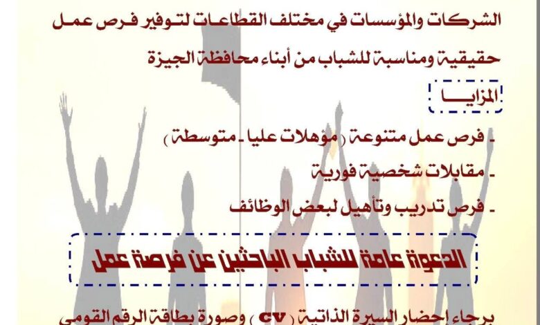 محافظة الجيزة..آلاف فرص العمل للشباب غدآ الأحد بأرض المطاحن بفيصل