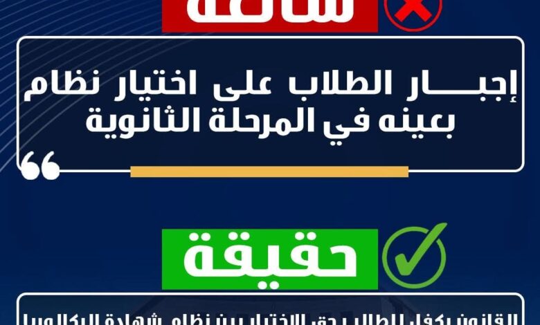 ترددت أقاويل في الآونة الأخيرة وانتشرت من خلال مواقع التواصل الإجتماعي المختلفة،تفيد بإجبار أولياء الأمور والطلاب علي إختيار نظام البكالوريا التى أقرته وزارة التربية والتعليم مؤخرآ وهو ما أثار قلق وغضب الطلاب وأحدث جدلآ كبيرآ،في هذا السياق أكد شادى زلطة المتحدث الرسمي باسم وزارة التربية والتعليم والتعليم الفني في تصريحات له،أن تلك الأقاويل التى ترددت في الآونة الأخيرة ما هى إلا شائعات لا أساس لها من الصحة،حيث أكدت الوزارة مرارآ وتكرارآ أن القانون يكفل للطالب الحق في الإختيار بين نظام الثانوية العامة وشهادة البكالوريا المصرية،ودور المدرسة ينحصر في التوعية وتوضيح كافة تفاصيل كل نظام منهم ولكن للطالب الحق في إختيار النظام المناسب له.