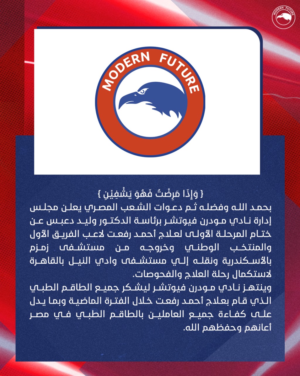 وينتهز نادي مودرن فيوتشر ليشكر جميع الطاقم الطبي الذي قام بعلاج أحمد رفعت خلال الفترة الماضية وبما يدل على كفاءة جميع العاملين بالطاقم الطبي في مصر أعانهم وحفظهم الله.