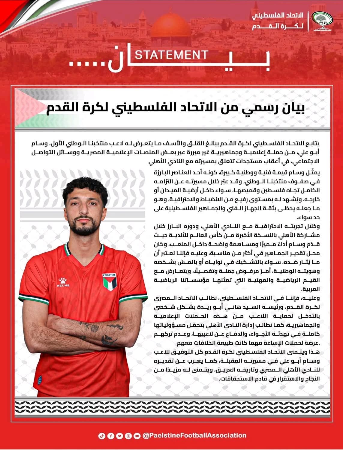 وجاء بيان الاتحاد الفلسطيني كالتالي: يتابع الاتحاد الفلسطيني لكرة القدم ببالغ القلق والأسف ما يتعرض له لاعب منتخبنا الوطني الأول، وسام أبوعلى، من حملة إعلامية وجماهيرية غير مبررة عبر بعض المنصات الإعلامية المصرية ووسائل التواصل الاجتماعي، في أعقاب مستجدات تتعلق بمسيرته مع النادي الأهلي.