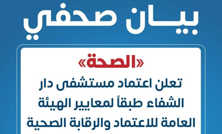 “الصحة”تعلن اعتماد مستشفي دار الشفاء طبقآ لمعايير الهيئة العامة للاعتماد والرقابة الصحية المعترف بها دوليآ