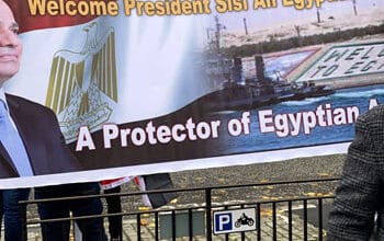 الجالية المصرية تستقبل الرئيس السيسى فى أدنبرة بعلم مصر ولافتات الترحيب