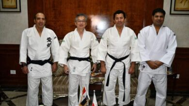 وزير الرياضة وسفير اليابان يشاركان المنتخبات الوطنية للجودو تدريبهم بالمركز الأوليمبى