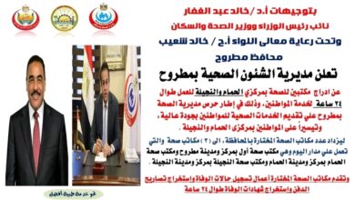 محافظ مطروح : تشغيل مكتبين للصحة بمدينتي الحمام و النجيلة للعمل 24 ساعة يوميا ضمن فئة مكاتب الصحة المختارة .